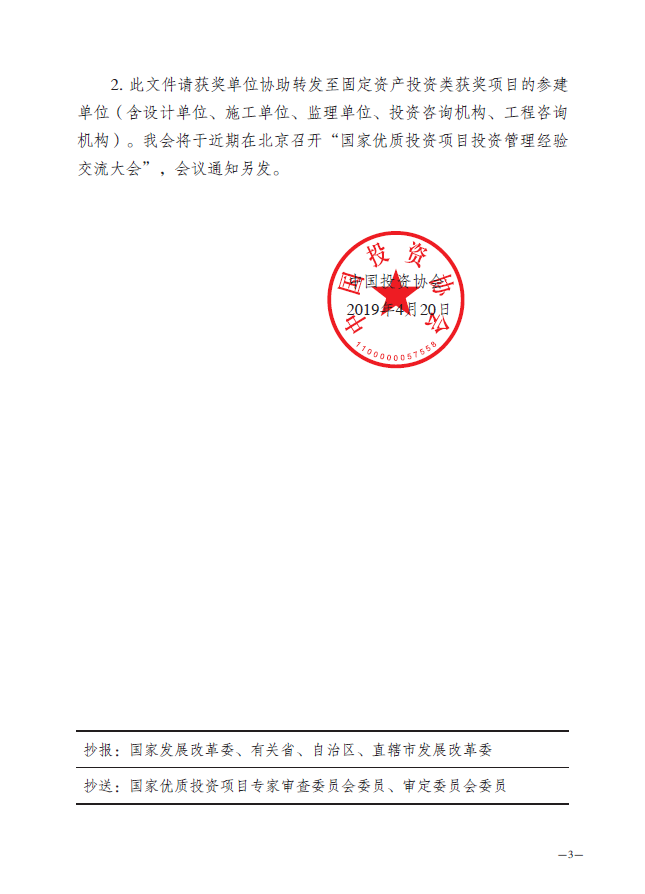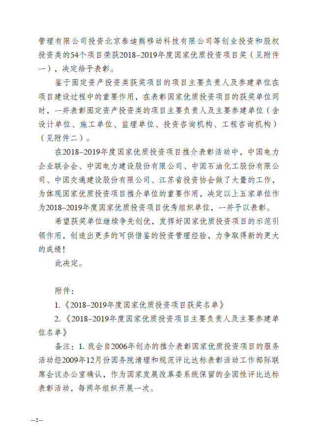 附《關(guān)于表彰2018-2019年度國家優(yōu)質(zhì)投資項(xiàng)目的決定》(中投協(xié)[2019]1號)。