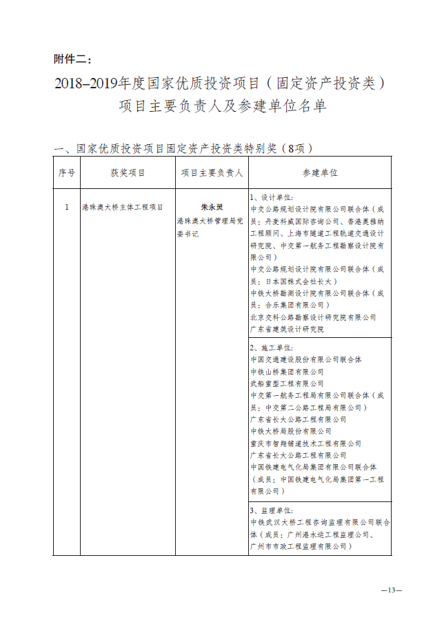 2019年4月20日,中國投資協(xié)會(huì)印發(fā)了《關(guān)于表彰2018-2019年度國家優(yōu)質(zhì)投資項(xiàng)目的決定》(中投協(xié)[2019]1號),港珠澳大橋主體工程項(xiàng)目榮獲2018-2019年度國家優(yōu)質(zhì)投資項(xiàng)目特別獎(jiǎng),華杰公司作為該項(xiàng)目投資咨詢機(jī)構(gòu)獲得表彰。