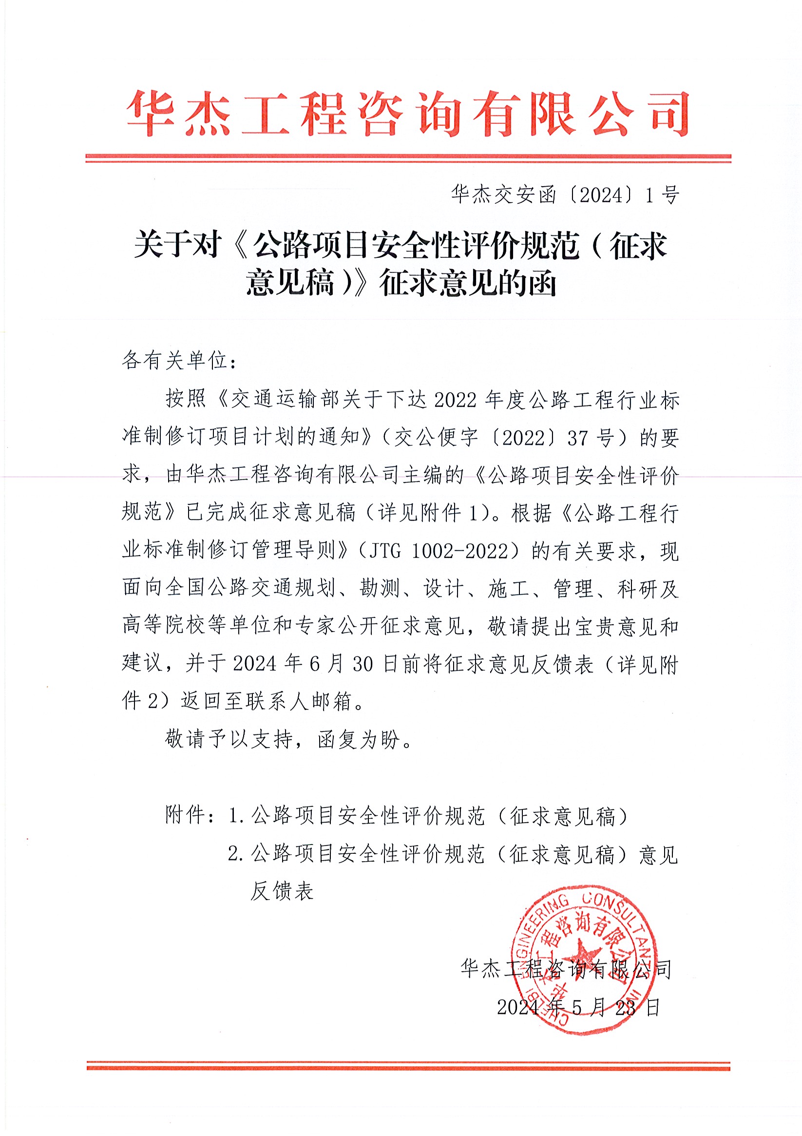 關(guān)于對(duì)《公路項(xiàng)目安全性評(píng)價(jià)規(guī)范(征求意見(jiàn)稿)》征求意見(jiàn)的函