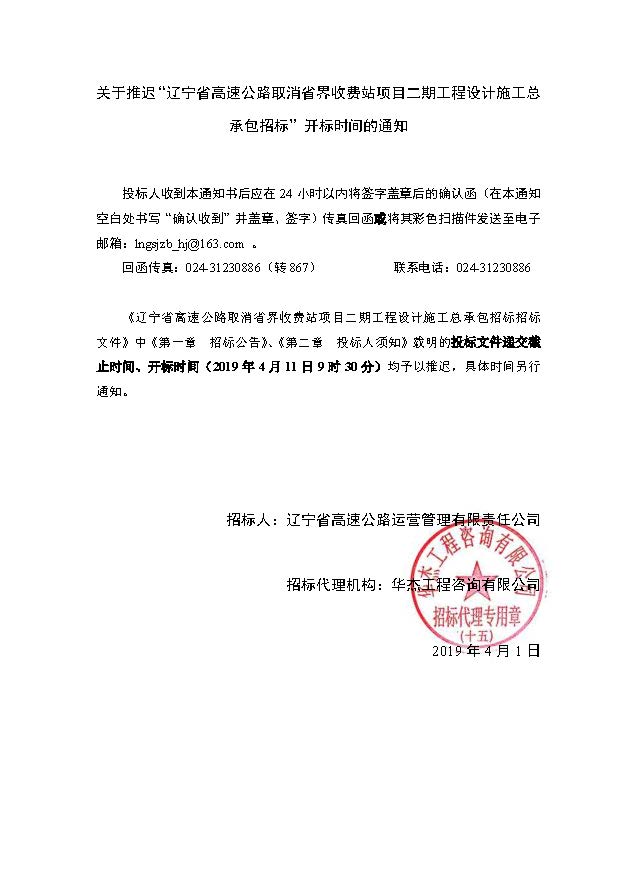 遼寧省高速公路取消省界收費(fèi)站項(xiàng)目二期工程設(shè)計(jì)施工總承包招標(biāo)——推遲開(kāi)標(biāo)時(shí)間的通知(2019-4-1)